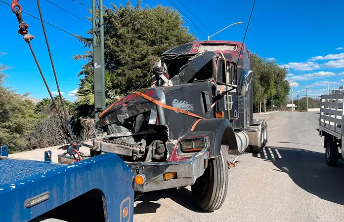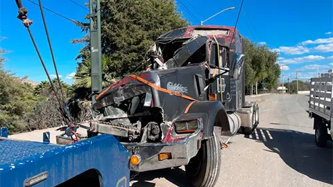 Al desprenderse de la grúa que lo remolcaba, un tractocamión se impactó contra un poste de alumbrado público en la bajada del puente de las vías a Tampico, en el Anillo Periférico Norte, sufriendo más daños de los que ya presentaba al participar anteriormente en otro percance.