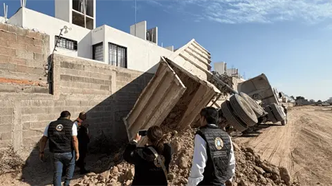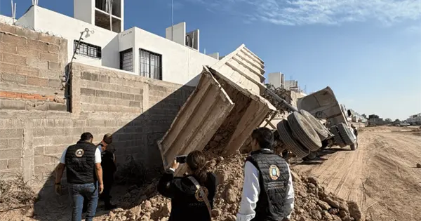 De acuerdo con la dependencia, la unidad involucrada es un Kenworth con placas TM6622-F, propiedad de Grupo CALER, que se inclinó durante la operación y provocó daños en al menos 5 viviendas colindantes. El incidente generó un riesgo inmediato para los residentes de la zona.