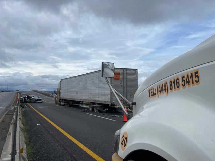 Una mujer muerta y tres personas más lesionadas es el saldo de un desigual choque entre un tráiler y un automóvil, ocurrido en el puente de la carretera a Zacatecas y el entronque a Ahualulco, en donde el carro terminó en pérdida total.