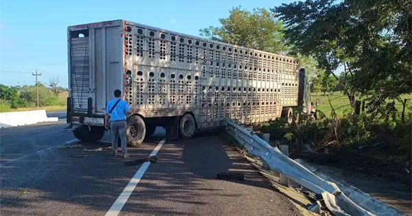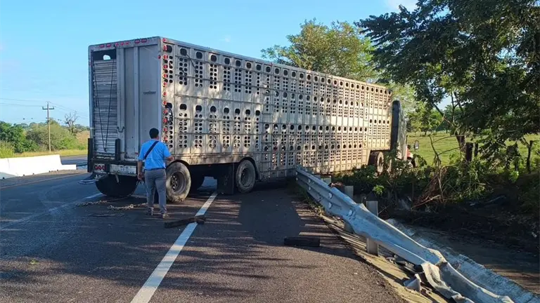 La madrugada de este sábado, el chofer de un tráiler con remolque tipo jaula ganadera ocasionó un aparatoso accidente, en el kilómetro 118 de la carretera de cuota Valles-Tamuín, cerca del entronque con la carretera libre.