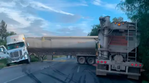 Minutos más tarde, el conductor de un tráiler circulaba por la misma zona, pero al observar el accidente se frenó, descuadrando y cayendo al desnivel que divide ambos carriles, para finalmente quedar obstruyendo los carriles centrales.