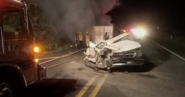 Fuentes oficiales informaron que el chofer de la pesada unidad perdió el control, volcó y la caja cayó sobre la camioneta, aplastándola. Posteriormente el remolque se incendió.