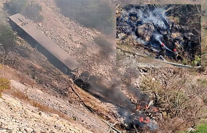RAYÓN.- Terrible muerte tuvo un trailero al quemarse cuando la unidad que conducía cayó a un barranco profundo en la carretera hacia Rayón, en donde quedó calcinado y los cuerpos de auxilio ya no pudieron salvarle la vida.