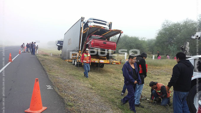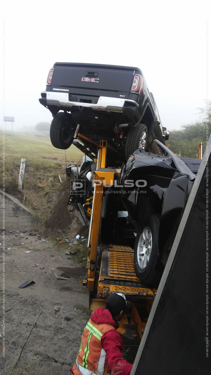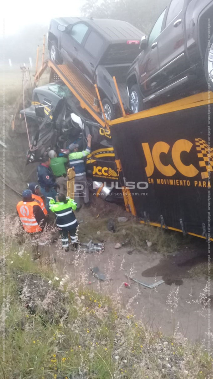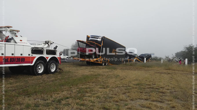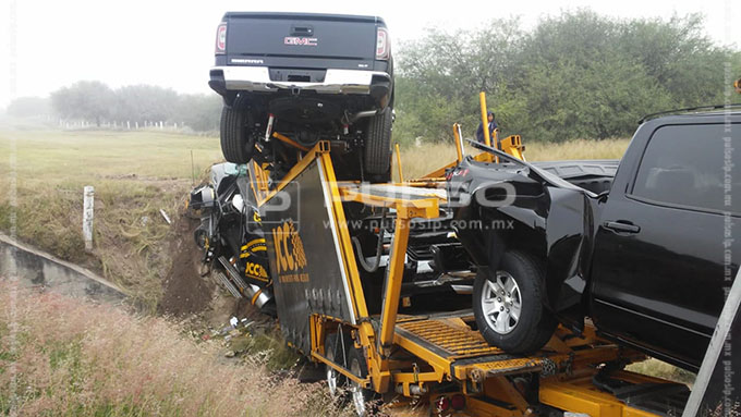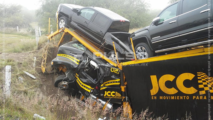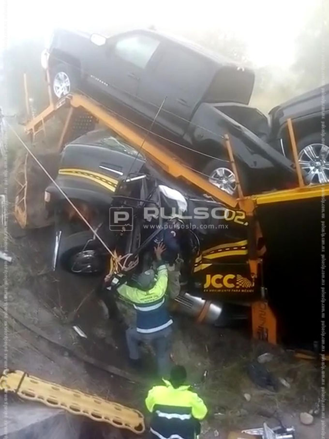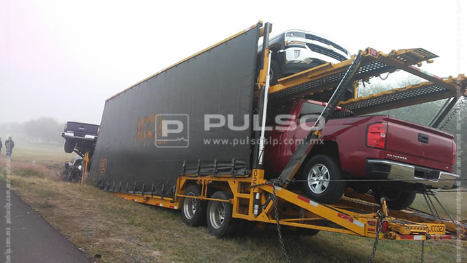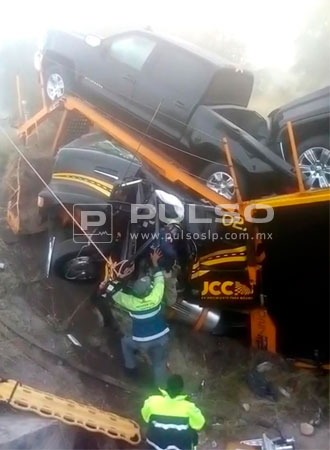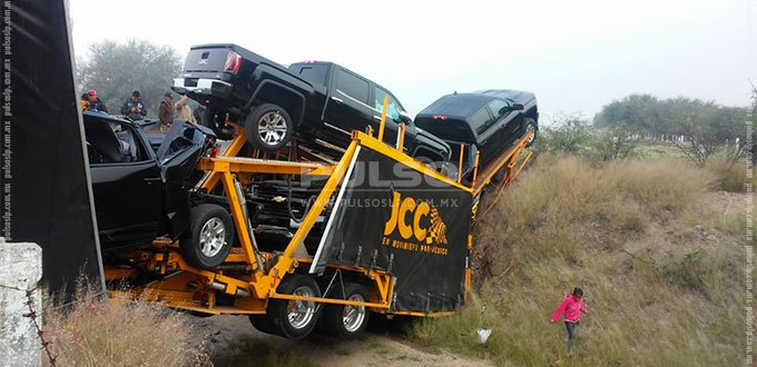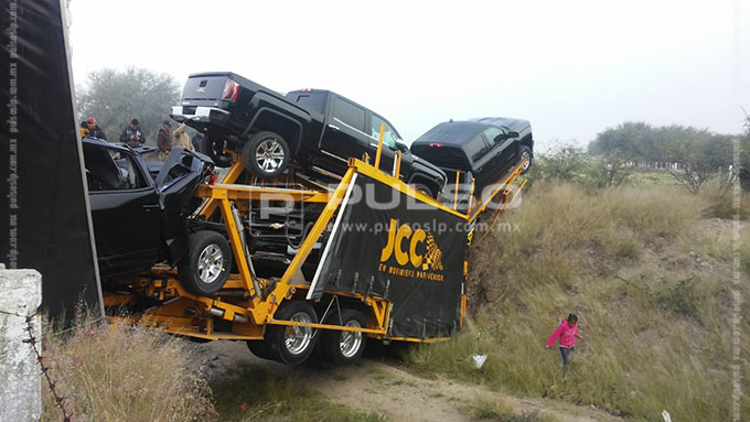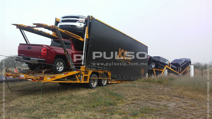 El tráiler Volvo tipo nodriza, iba cargada de camionetas de lujo y circulaba por la carretera de cuota, guiado en dirección de Villa de Arriaga a la carretera a México.