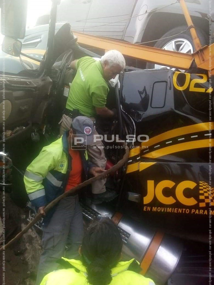 Chofer de un tráiler resultó lesionado al quedar atrapado entre los fierros retorcidos de la cabina al caer a un desnivel de aproximadamente 4 metros de profundidad; circulaba por la carretera de cuota de Villa de Arriaga a carretera 57, a la altura de La Pila.
