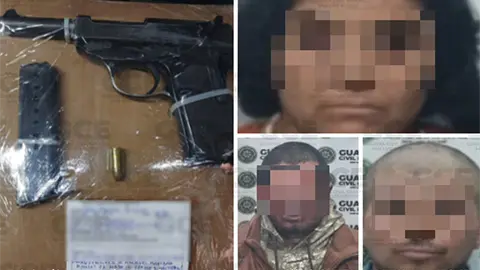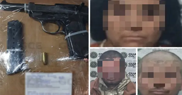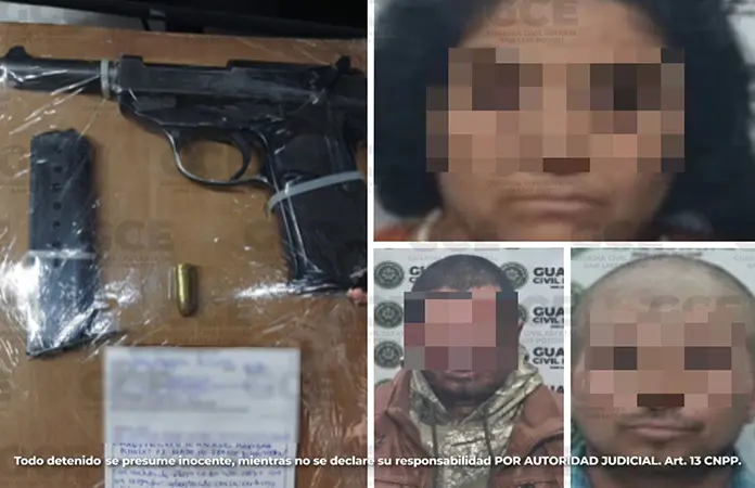 Los detenidos son un par de hermanos, José "N" de 42 años y María "N" de 44 años, además de Ricardo "N" de 48 años, este último asegurado con una pistola calibre 9 milímetros, abastecida con un cargador y un cartucho útil.