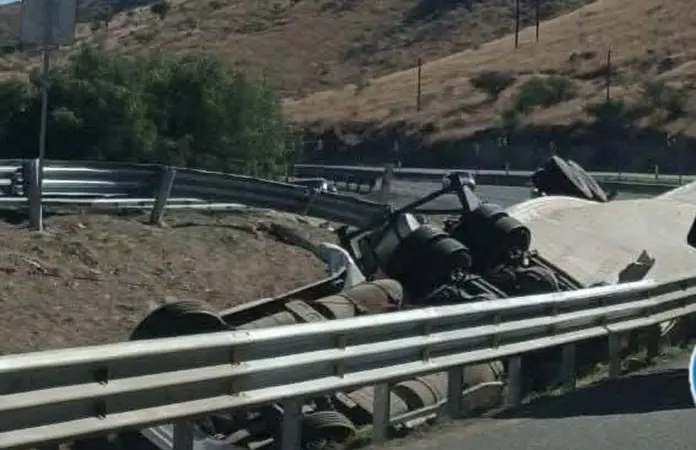 Fue a la altura de la comunidad de fracción Sánchez, perteneciente al municipio de Santa María del Río, en donde el conductor perdió el control del volante al tomar una curva y fue así que el tráiler acabó volcado derribando parte de la contención metálica, quedando el tractocamión con las llantas hacia arriba.