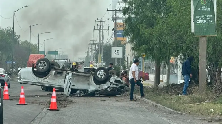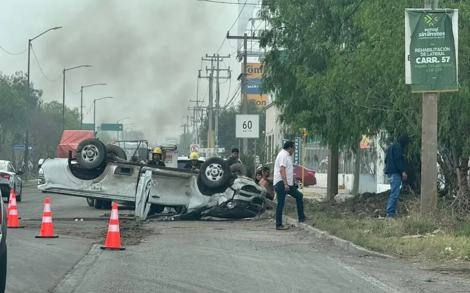 Un vehículo volcó la mañana de este lunes sobre la lateral de la carretera 57, en la Zona Industrial de San Luis Potosí, lo que dejó a una persona lesionada y daños materiales.