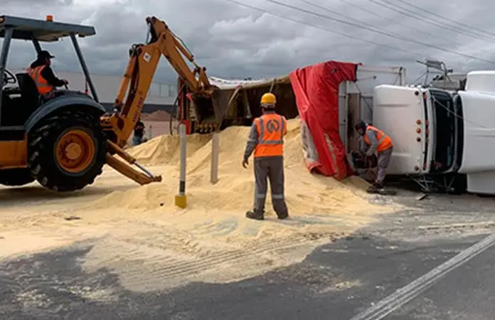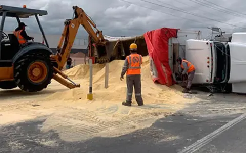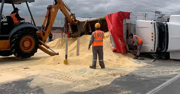 Afortunadamente no se registraron lesionados en este accidente, pero el maíz molido que transportaba el camión rumbo a una procesadora de alimentos para aves, se esparció en la zona y tuvieron que llevar una pala mecánica para recogerlo y pasarlo a otro vehículo para que fuera llevado a su destino.