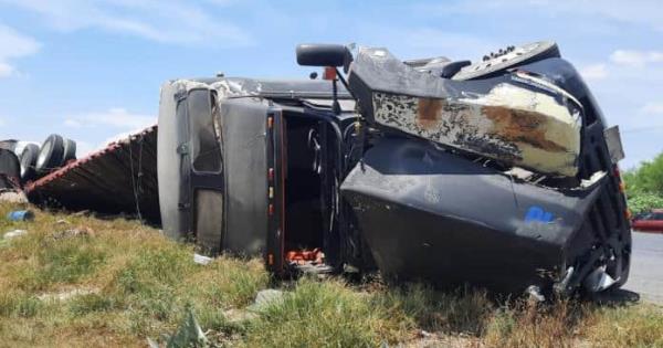 En el percance se vio involucrado el conductor de un tráiler con plataforma acoplada con dos rollos de acero, quien perdió el control de la pesada unidad hacia su derecha para posteriormente volcar sobre su costado derecho.