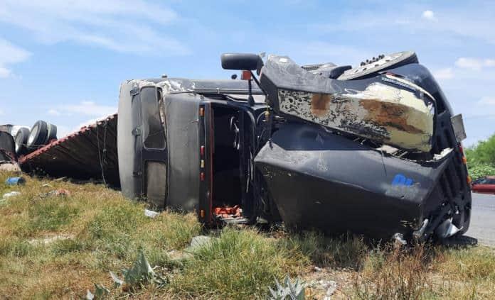 Vuelca tráiler cargado con 2 rollos de acero en la Zona Industrial