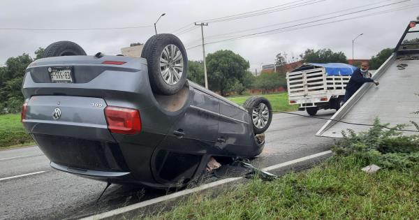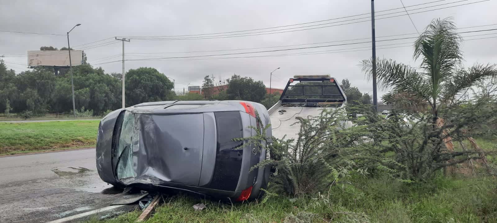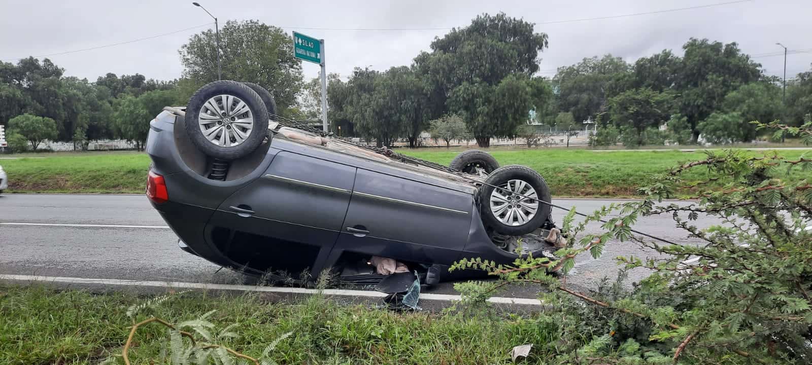 Solo daños se reportan tras una volcadura en el km 194 de la Carretera 57 frente a la entrada a la Colonia Santa Bárbara en Villa de Pozos con dirección al Distribuidor Juárez.