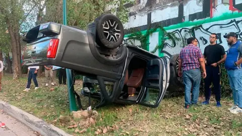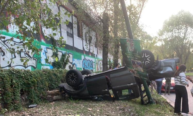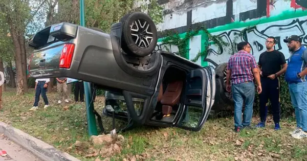 Al salir de una curva abierta hacia la derecha, el conductor perdió el control del volante, se estrelló contra un poste y enseguida la camioneta quedó volcada con las llantas hacia arriba sobre el área verde del bulevar.