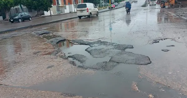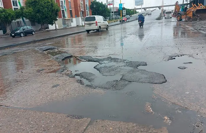 Peligrosos baches y encharcamientos derivados de las recientes precipitaciones se registran en un tramo de la avenida Acceso Norte, en el municipio de Soledad de Graciano Sánchez.