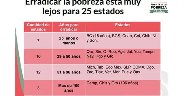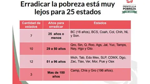 El documento señala que, tomando en cuenta que las mediciones del extinto Consejo Nacional de Evaluación de la Política Social (Coneval) y el Instituto Nacional de Estadística y Geografía (Inegi), entre 2016 y 2024, se registró una baja de 45 por ciento en la reducción de la población en condiciones de pobreza, con ese ritmo, tomaría 59 años reducir el indicador sólo al dos por ciento de la población.