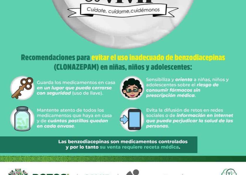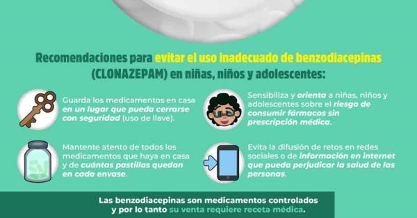 Algunas recomendaciones para padres de familia y docentes sobre el uso inadecuado de benzodiacepinas en niños, niñas y adolescentes son: guardar los medicamentos en casa en un lugar que pueda cerrarse con seguridad, tener control de todos los medicamentos que haya en casa y de cuántas pastillas quedan en cada envase, sensibilizar y orientar a niños, niñas y adolescentes sobre el riesgo de consumir fármacos sin prescripción médica, evitar la difusión de retos en redes sociales o de información en internet que pueda perjudicar la salud de las personas y conocer y vigilar los medicamentos que los niños, niñas y adolescentes consumen dentro de las instituciones educativas.