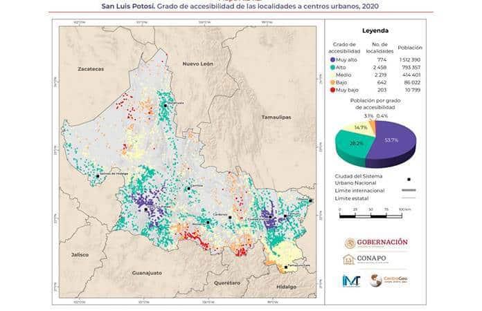 De acuerdo al estudio “Análisis geoespacial de la accesibilidad a centros urbanos de las localidades de México”, el 13.4 por ciento de las seis mil 296 localidades potosinas tienen niveles muy bajos y bajos de accesibilidad a los centros urbanos más cercanos.