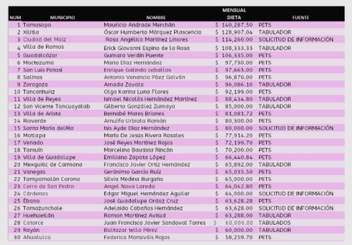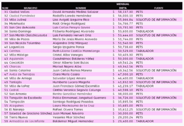 El reporte señala que los síndicos mejor pagados son los de San Luis Potosí capital, con 68,724 pesos mensuales. En tanto, los regidores de Villa de Reyes encabezan la lista con percepciones de 66,038 pesos.