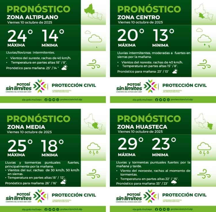 De acuerdo con el pronóstico, se espera probabilidad de lluvias y tormentas fuertes a muy fuertes, principalmente en las sierras y en la zona sur de la Huasteca y la Zona Media. En el Altiplano y Zona Centro se prevén lluvias puntuales, con posibilidad de precipitaciones intensas en áreas serranas.
