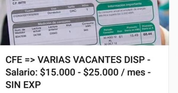 En uno de los ejemplos de estas ofertas, se puede leer “Gran oportunidad en CFE – Varias vacantes disponibles. Salario $ 15 000.00 - $ 25 000.00 / mes. SIN EXPERIENCIA”.