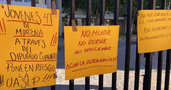 En el exterior se pueden ver las cartulinas en exigencia de respeto a la autonomía de la casa de estudios potosina.