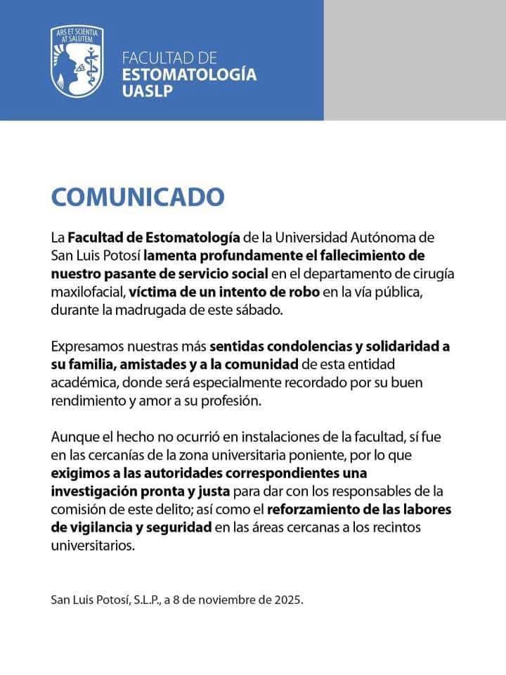 Un estudiante pasante de servicio social del departamento de cirugía maxilofacial de la Facultad de Estomatología de la UASLP, fue asesinado ayer por la madrugada durante un intento de asalto.
