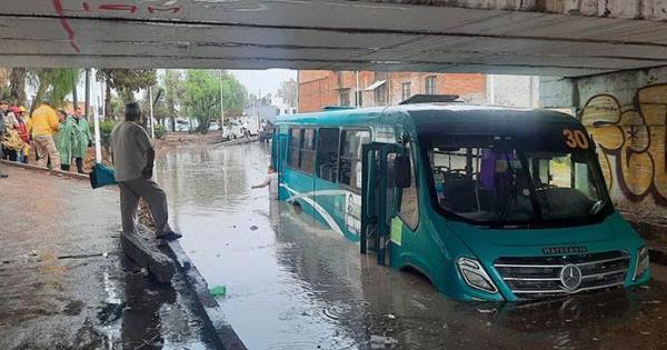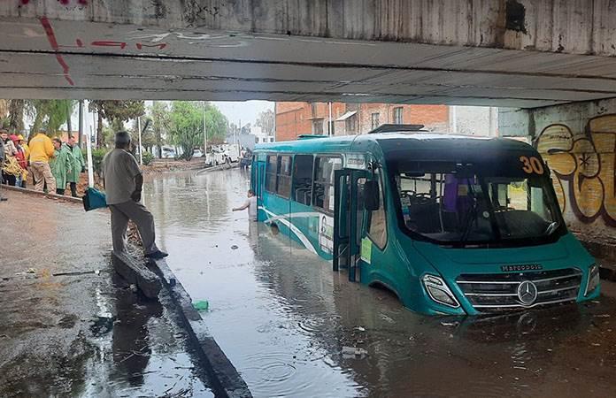 Por la inundación en el río Españita, un camión urbano y un automóvil particular se quedaron varados, los pasajeros fueron rescatados por socorristas y nadie salió herido.