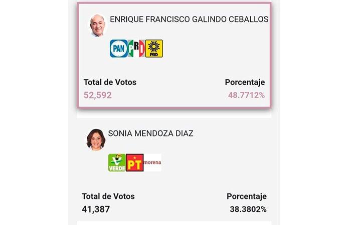 Al tener contabilizadas 547 de 3 mil 925 actas, el 13.93 por ciento del total, Galindo Ceballos aventaja en las preferencias con el 47.66 por ciento.