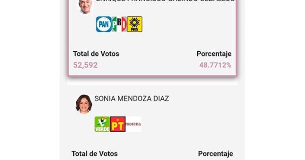 Su más cercana competidora es la candidata de la coalición Sigamos Haciendo Historia, integrada por los partidos Verde Ecologista de México, del Trabajo y Morena, Sonia Mendoza Díaz con el 39.28%.