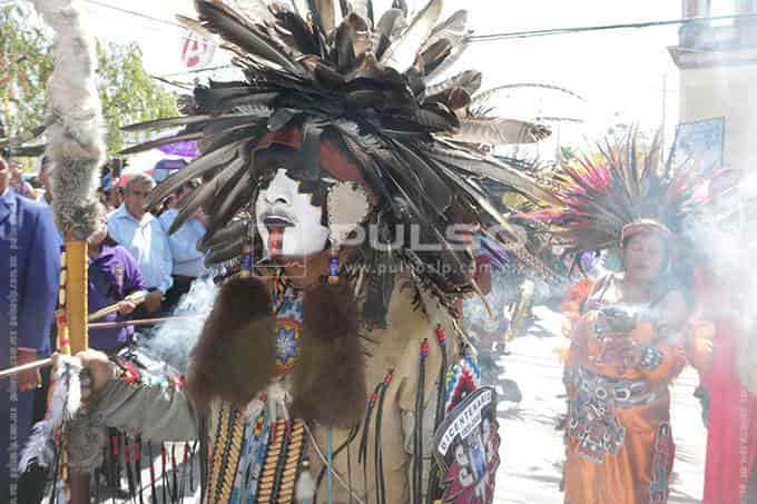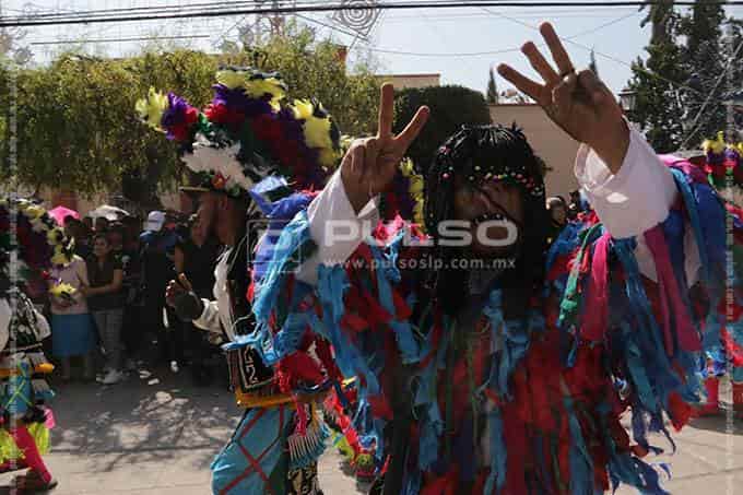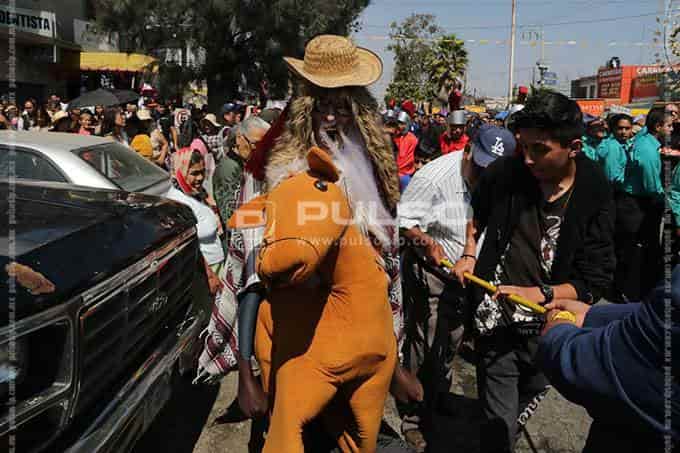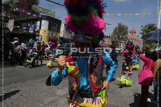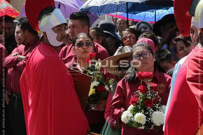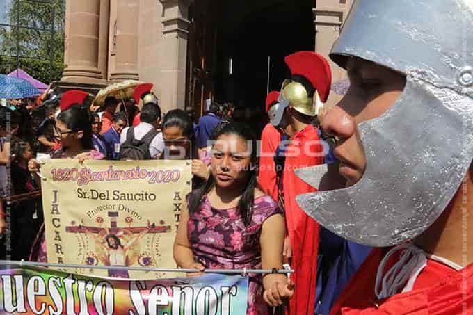 Al salir completamente del templo, el Señor del Saucito comenzó una procesión por calles aledañas, acompañado por creyentes, mariachis y cientos de comparsas, en su mayoría integrada por miembros que portaban penachos y máscaras.