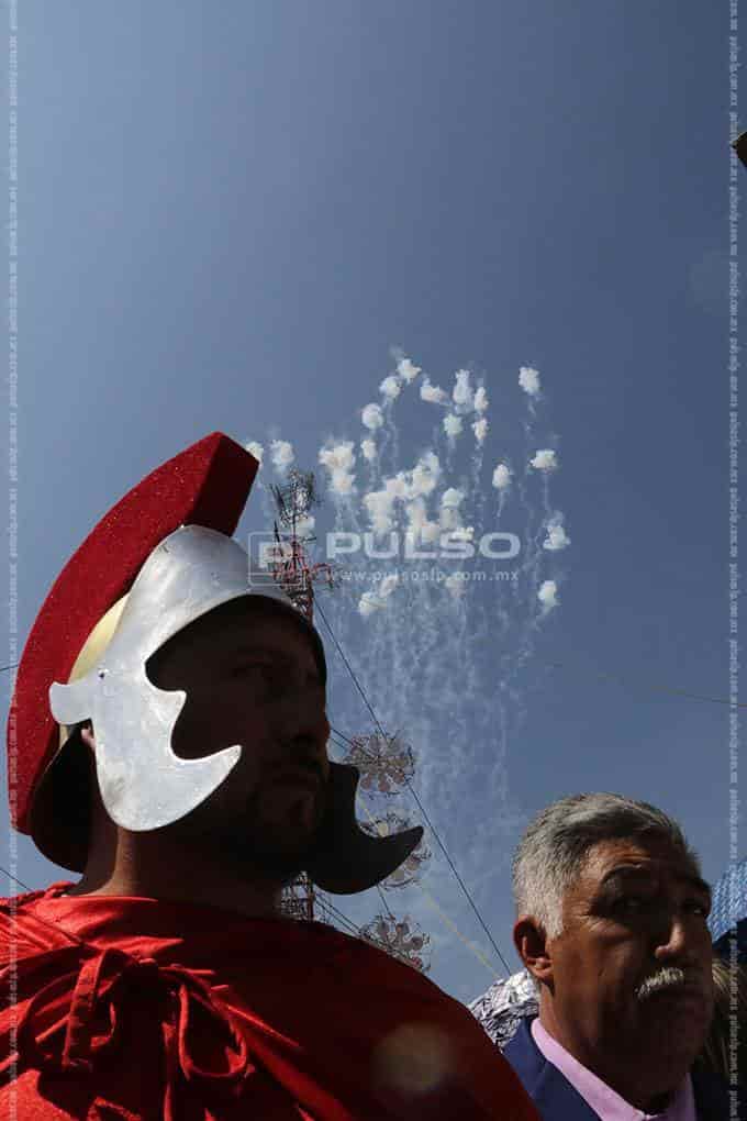 Previo a la salida de la imagen de poco más de dos metros de alto por dos de amplitud, la comitiva a cargo de la actividad religiosa detonó decenas de fuegos pirotécnicos, ubicado a las afueras del inmueble religioso.