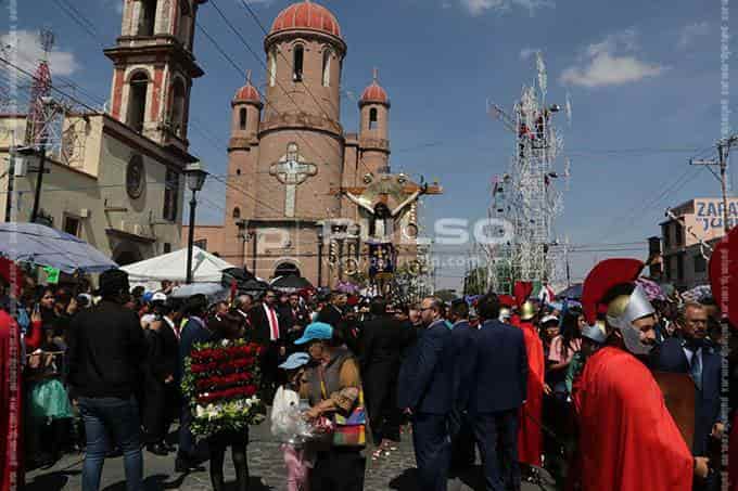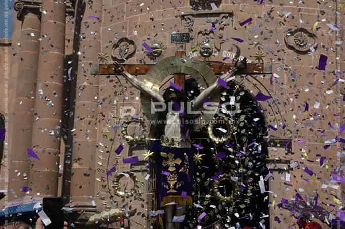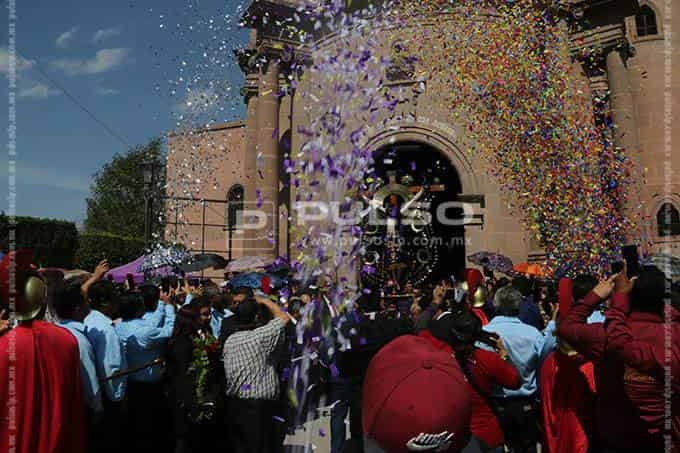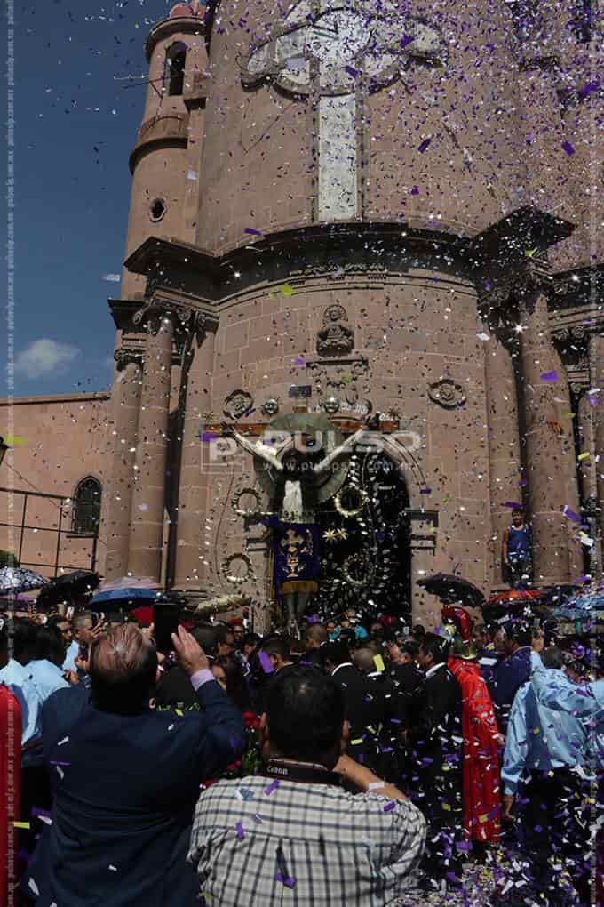 Una vez que inició el recorrido del también llamado Señor de Burgos, comenzaron a resonar por más de 15 minutos las campanas de la parroquia y estallaron miles de pedazos de papel picado, que cubrieron la explanada del inmueble católico.
