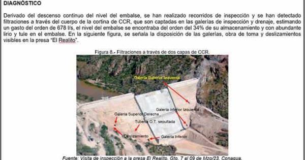 L”as filtraciones a todo lo largo de la galería son cuantiosas, ocurren a través de las juntas verticales, las capas de CCR y la losa superior; los drenes se encuentran en funcionamiento y tienen aportaciones muy importantes de agua hacia el interior de la galería”, reporta el texto.