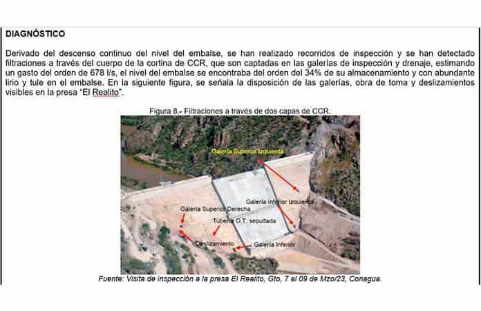 En los primeros meses de 2023, señala el documento, varias visitas de inspección detectaron algunas filtraciones el cuerpo de la cortina, construida bajo el sistema de concreto comprimido con rodillo (CCR).