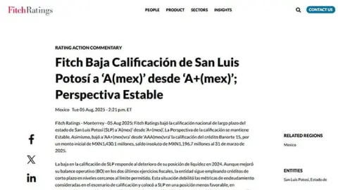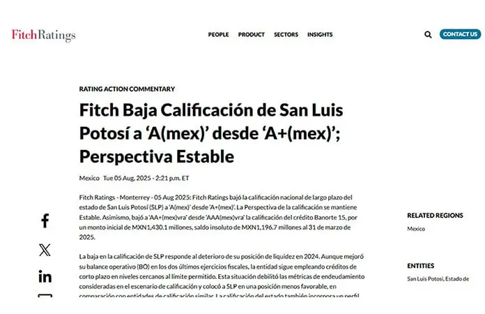 El documento detalla que “la baja en la calificación de SLP responde al deterioro de su posición de liquidez en 2024. Aunque mejoró su balance operativo en los dos últimos ejercicios fiscales, la entidad sigue empleando créditos de corto plazo en niveles cercanos al límite permitido. Esta situación debilitó las métricas de endeudamiento consideradas en el escenario de calificación y colocó a SLP en una posición menos favorable, en comparación con entidades de calificación similar”.