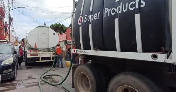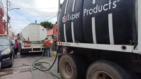 Sin un operativo vial, operadores de una pipa oficial estatal y un camión hidroneumático contratado por el Gobierno del Estado, iniciaron el desfogue de un drenaje de una casa particular, pero bloquearon la calle de Comonfort al tráfico, sin importarles que los vehículos se atoren.