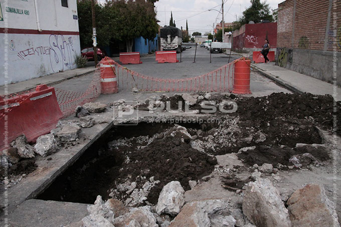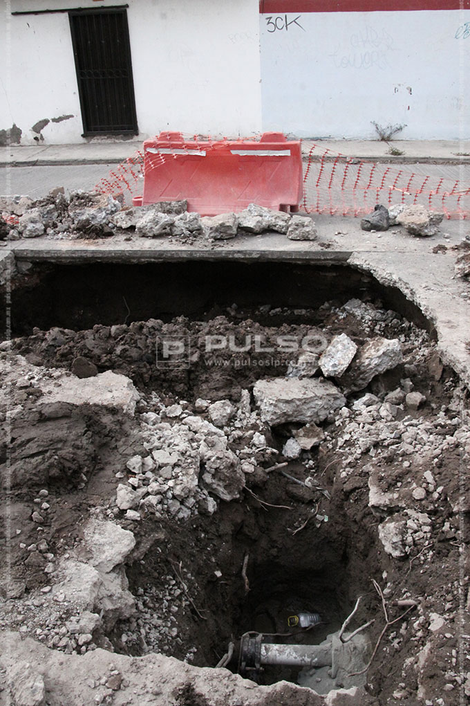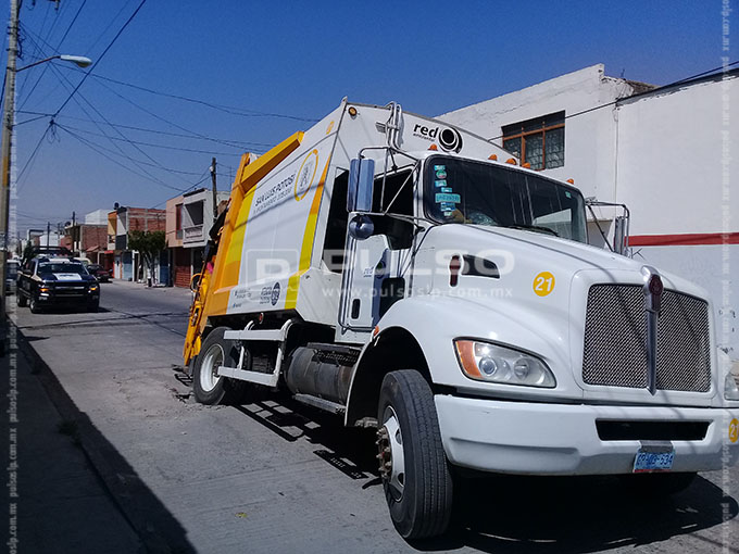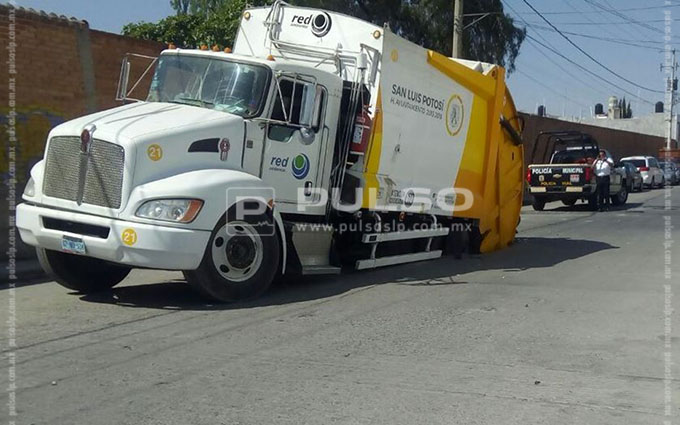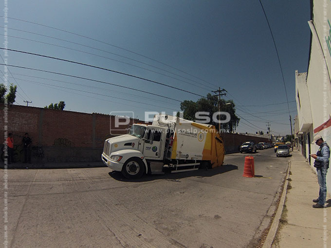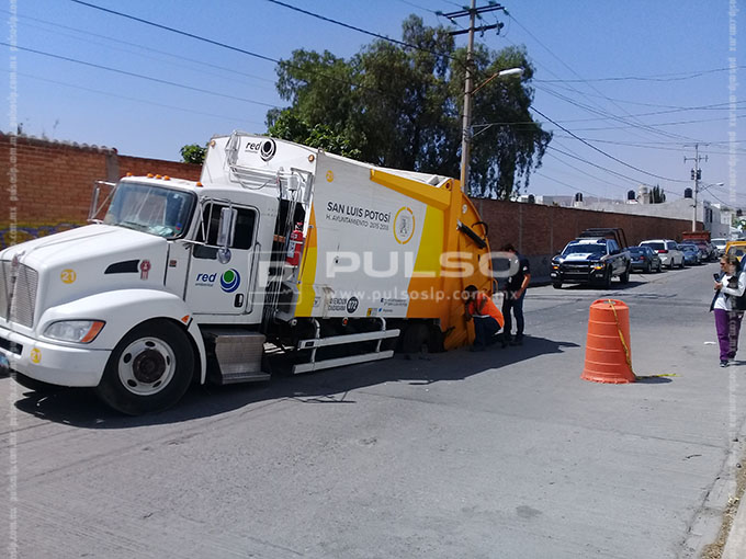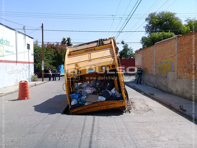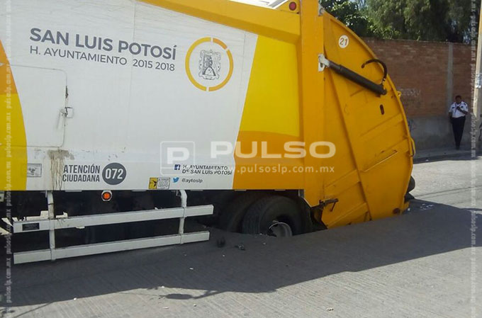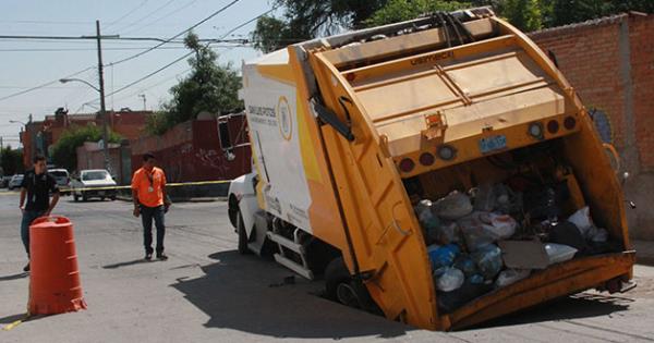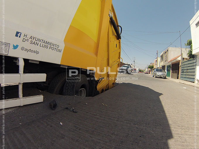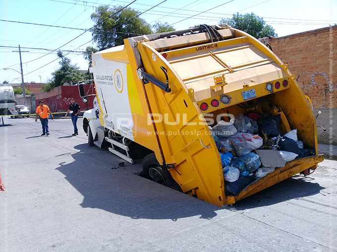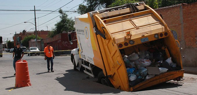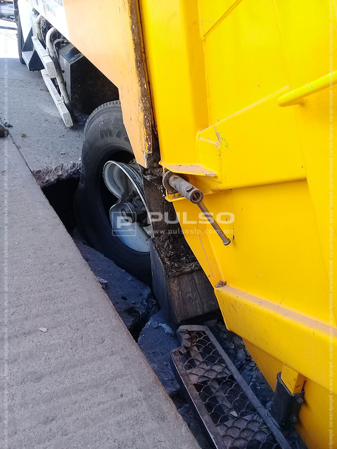 Un hundimiento de aproximadamente tres metros de largo y dos de profundidad se tragó la parte trasera de un camión recolector de basura que transitaba por el lugar, en la calle Lourdes casi esquina con Comanjilla, en San Leonel.