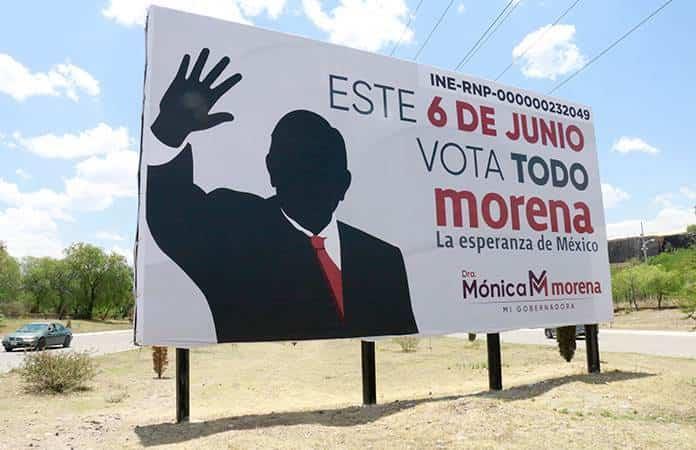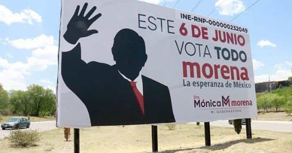 La silueta del presidente Andrés Manuel López Obrador forma parte de espectaculares de apoyo a Mónica Liliana Rangel Martínez y los candidatos de Morena.