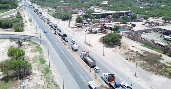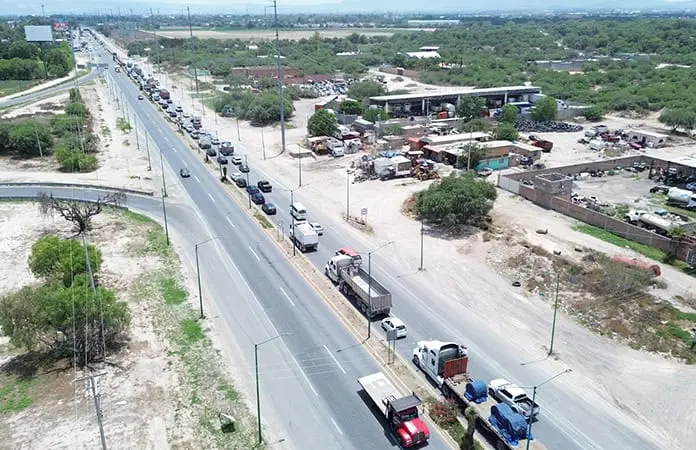 Debido a la obra en el carril que conduce hacia San Luis Potosí, un tramo se reduce a un solo carril, generando largas filas, algunas de las cuales llegan hasta el monumento a Graciano Sánchez sobre la Carretera 57.