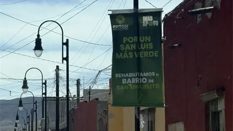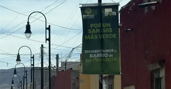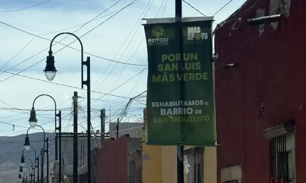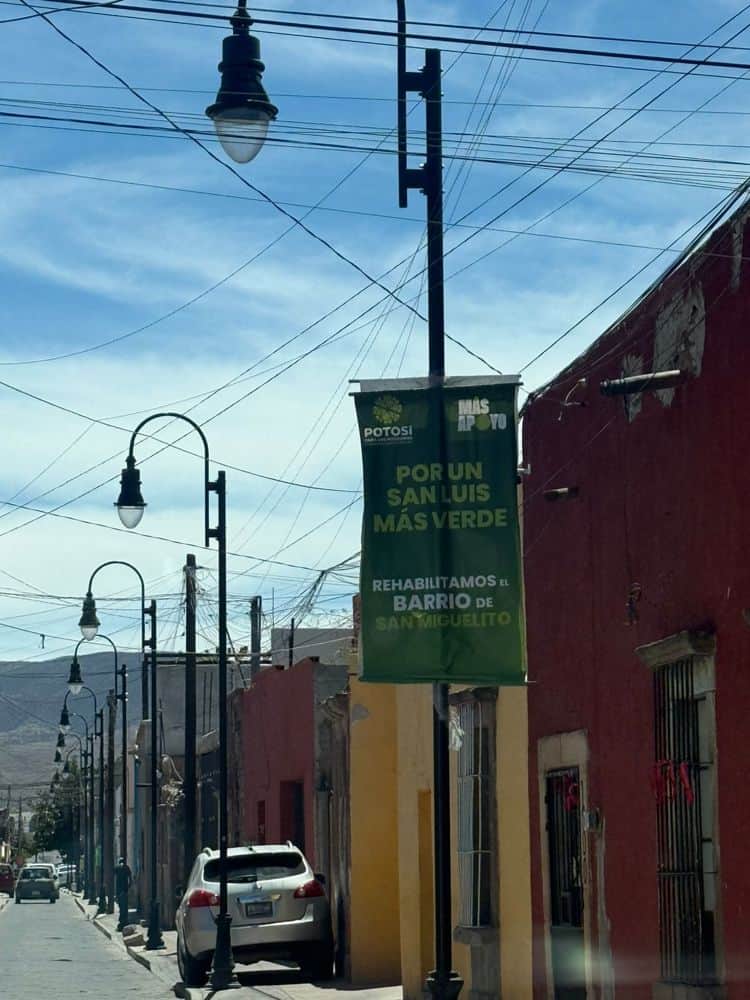 Un cartel de publicidad institucional del Gobierno del Estado de San Luis Potosí, colocado sobre la calle de Independencia en el Centro Histórico, promueve el mensaje "Por un San Luis más verde" y "Rehabilitamos el barrio de San Miguelito".