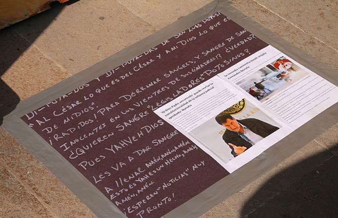 El personaje colocó una serie de cartulinas con fotos de sacerdotes y reclamos relacionados con los errores de los religiosos católicos, justo en la puerta principal de acceso al edificio del Arzobispado, en la esquina de Madero y Díaz de León.