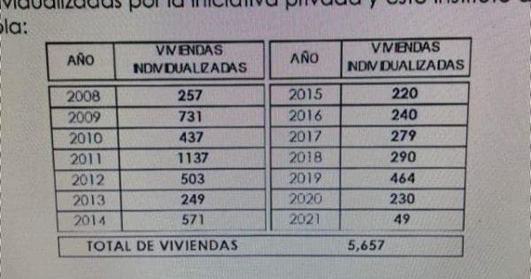 El reporte de viviendas individualizadas al 30 de septiembre de este año, solicitado al propio Invies, reconoce 5 mil 647, tanto por la iniciativa privada como por el propio instituto. Comparado con las metas iniciales de hace catorce años, cuando la Federación le concedió apoyos por cien millones de pesos para construir e individualizar (entregar) 3 mil viviendas en el plazo de ocho meses. En el primer año de cuenta de construcción de casas, 2008, Invies reporta 257; el mejor año fue 2011, con mil 137 viviendas individualizadas, ni la mitad de las fijadas en el año de arranque.