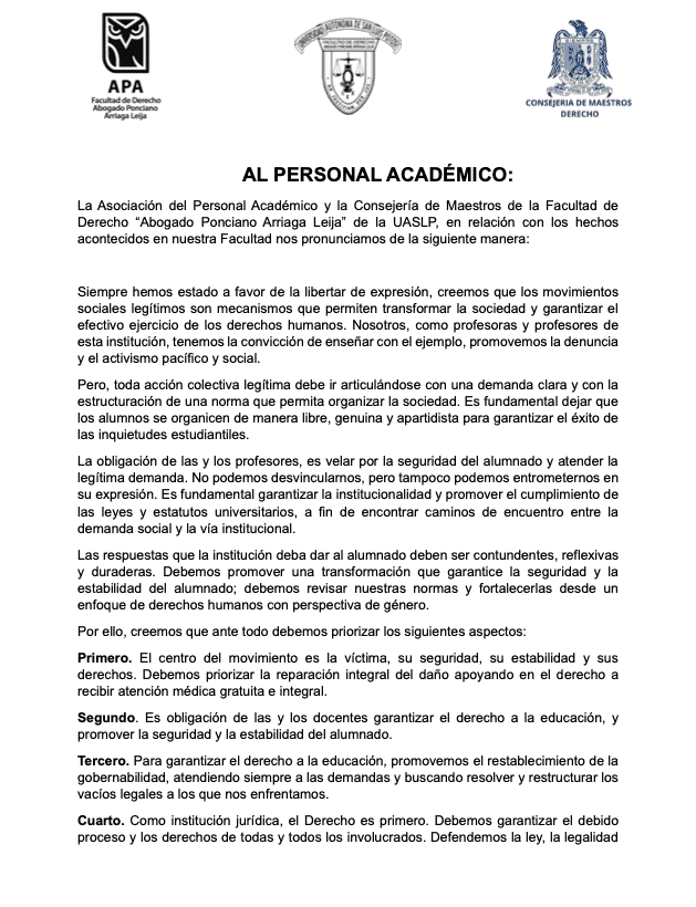 La Asociación del Personal Académico (APA) y la Consejería de Maestros de la Facultad de Derecho "Abogado Ponciano Arriaga Leija" de la Universidad Autónoma de San Luis Potosí emitieron un pronunciamiento en el que respaldan al rector Alejandro Zermeño Guerra, pero lo exhortan a ejercer liderazgo y restablecer la legalidad tras la crisis generada por el caso de una alumna presuntamente violada dentro de las instalaciones universitarias.