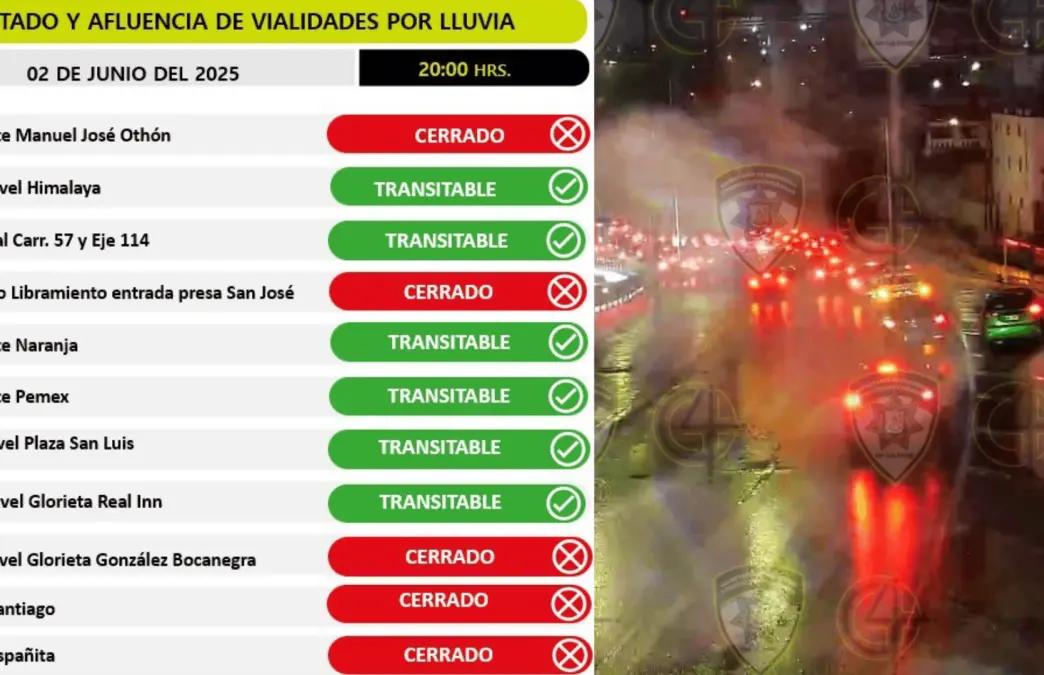 Debido a las intensas lluvias registradas durante las últimas horas en la capital potosina, diversas vialidades han sido cerradas de manera preventiva para evitar incidentes. Las autoridades exhortan a la ciudadanía a manejar con extrema precaución y considerar rutas alternas.