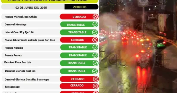 Elementos de la Policía Vial y cuerpos de emergencia ya se encuentran realizando patrullajes y monitoreo constante en las zonas de riesgo. Se recomienda a los automovilistas mantenerse informados por canales oficiales y evitar transitar por pasos a desnivel, ríos o calles anegadas.