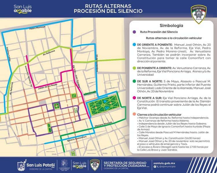 San Luis Potosí.- La Secretaría de Seguridad y Protección Ciudadana implementó un operativo vial en calles del Centro Histórico con motivo de la Procesión del Silencio, lo que generó cierres en diversas vialidades.
