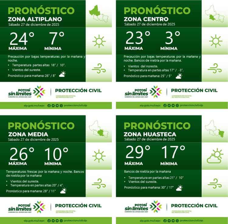 La Coordinación Estatal de Protección Civil (CEPC) informó que el Frente Frío número 24 mantiene probabilidad de lluvias y tormentas puntales principalmente por la mañana en la zona huasteca de San Luis Potosí.