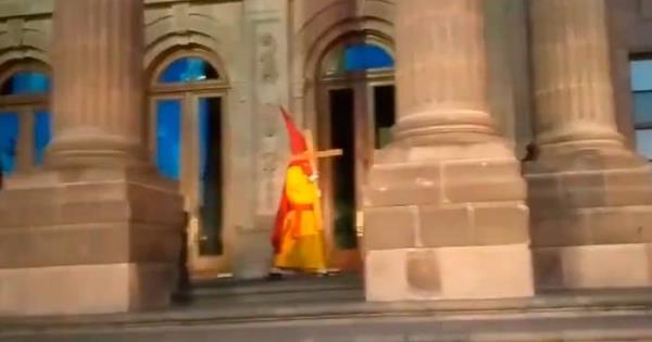 Con un cubrebocas, el penitente de la Cofradía del Encuentro, que se caracteriza por su vestuario amarillo y rojo, cargó una pequeña cruz de madera mientras caminó por las escalinatas del Teatro de la Paz, la Plaza de Armas, el Jardín de San Francisco y otros lugares emblemáticos del Centro Histórico.