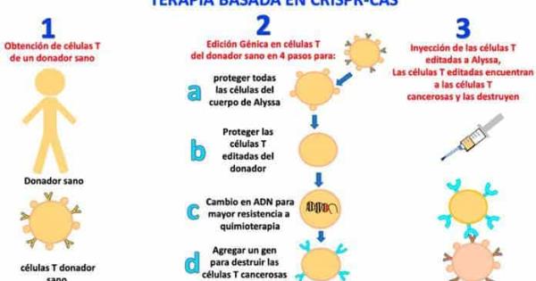 1). La primera edición de las células T del donador fue para proteger a todas las células de Alyssa, ya que podrían ser atacadas por las células T del donador. La edición eliminó un gen que produce una proteína que podría destruir las células de Alyssa.