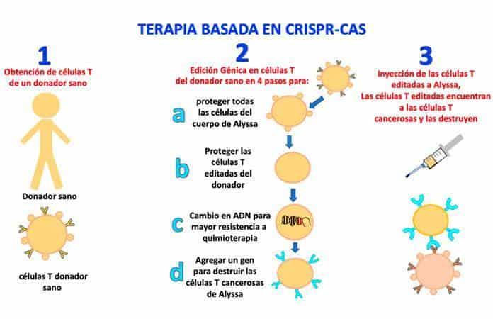 2). La segunda edición fue para proteger las células T del donador, ya que el sistema inmune de Alyssa las atacaría al reconocerlas como ajenas. Es decir, se eliminó otro gen en las células T del donador que las identifica como células que no pertenecen a Alyssa.